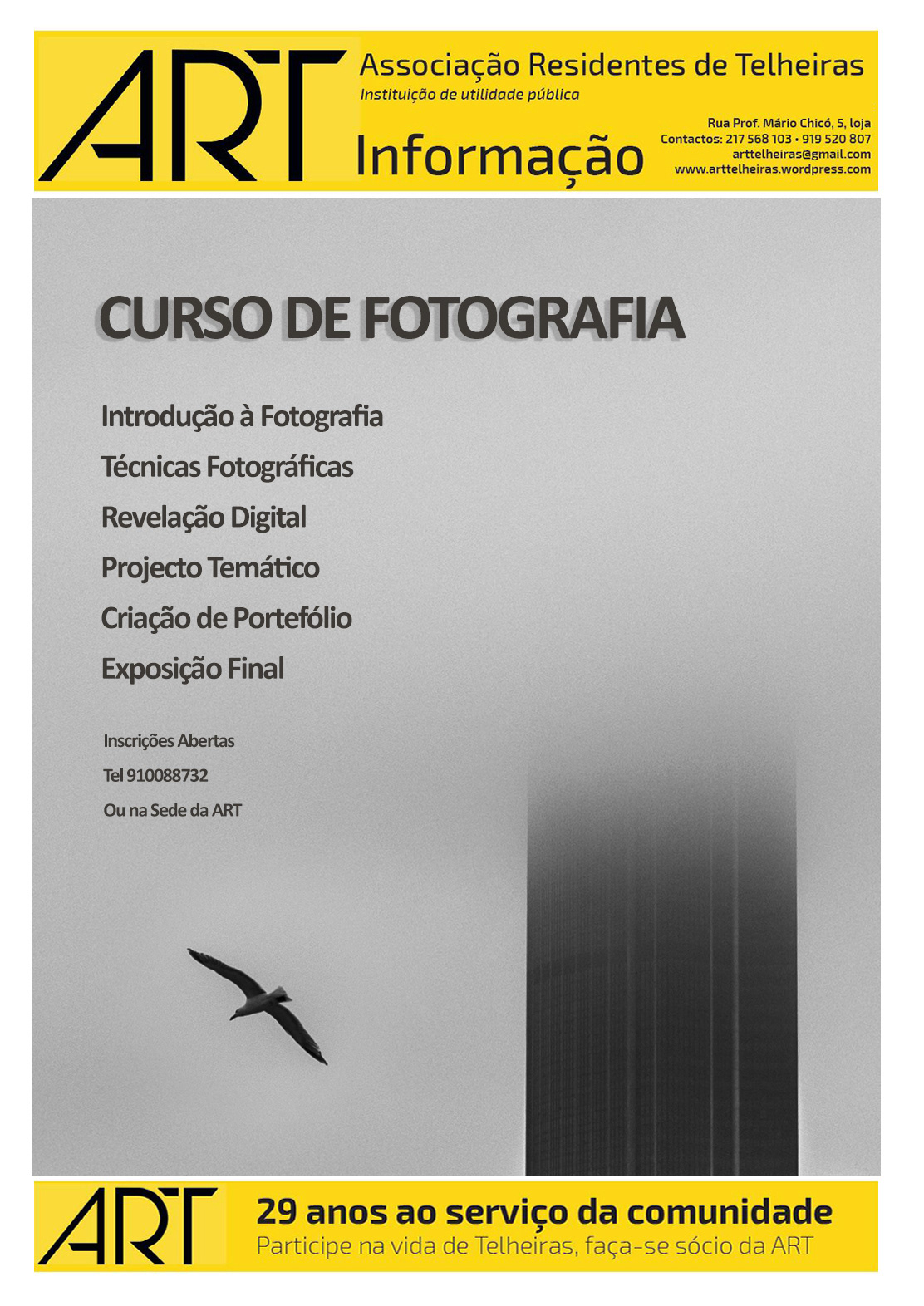 A Câmera Fotográfica; diafragma; velocidade de obturação; sensibilidade (ISO); Fotometria (Medição Pontual, Matricial e Ponderada ao centro); Profundidade de Campo; Iluminação (flash e luz natural); Óptica; Composição e Enquadramento; Revelação Digital (DarkTable); Projecto Fotográfico e Exposição Final.